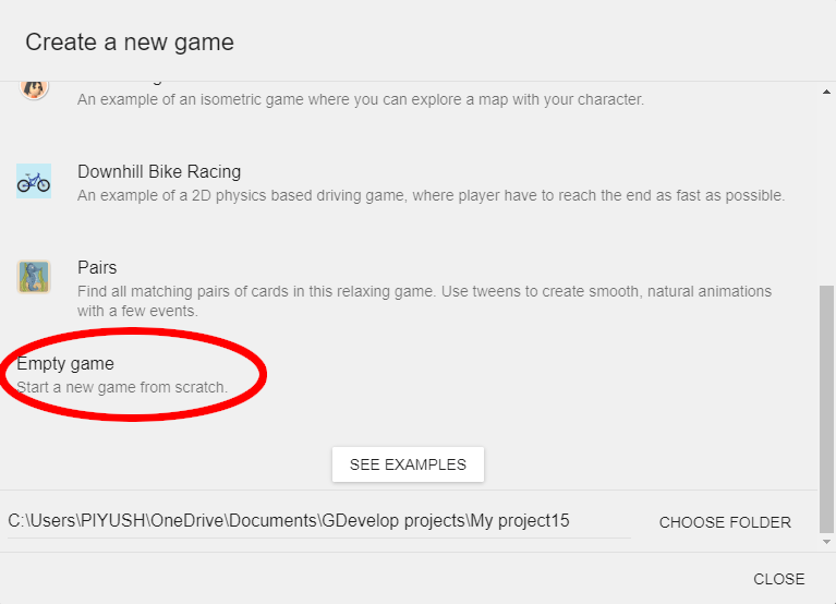 Click on Empty game (you might have to scroll down to find this option) in the dialog box that appears and choose the location where you want to save your project.