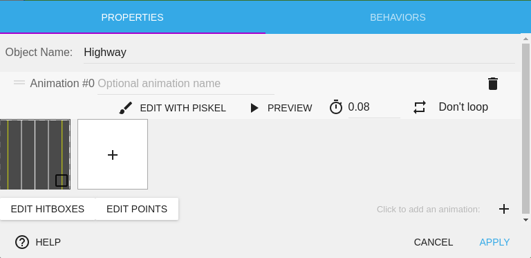 Let's add an animation to the object. Animations are containing images that are displayed on screen for Sprite objects.