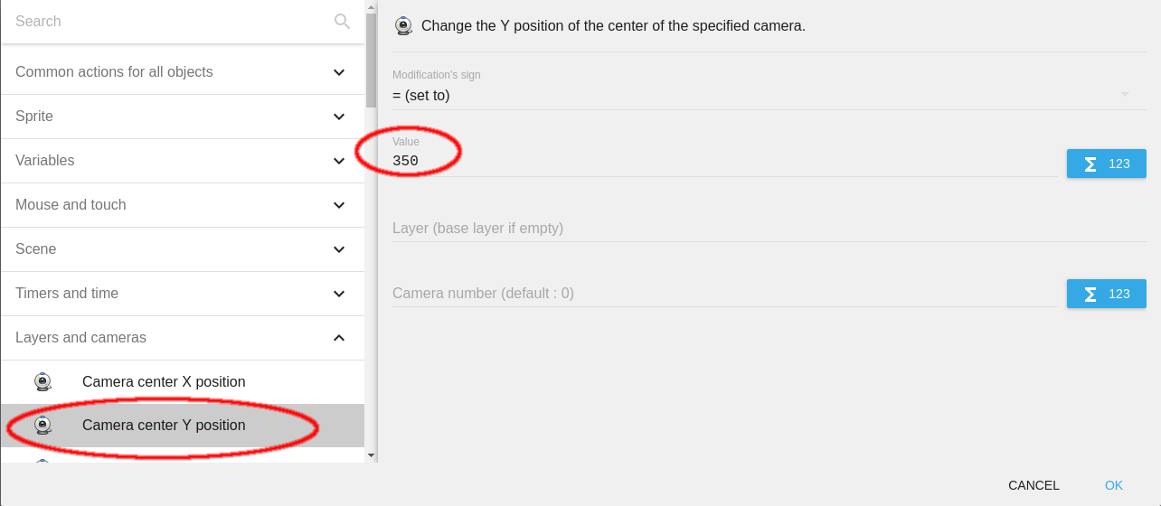 For example, to change the position of the camera, you can go to Layers and Cameras followed by Camera center X position. The right part of the window will now display configurable parameters.