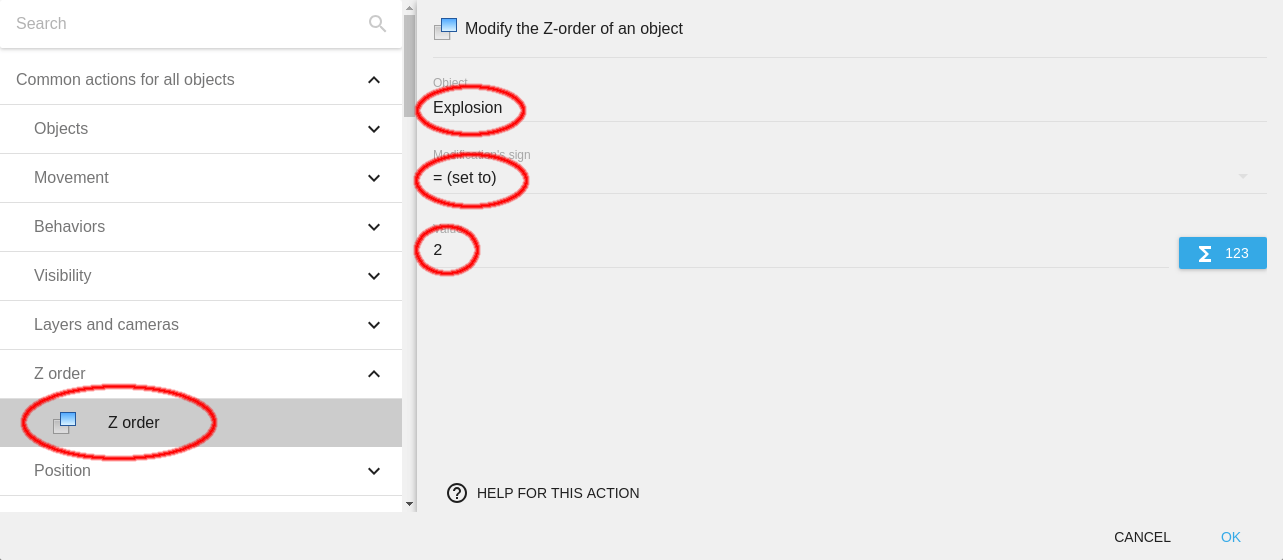 In case of this condition being true, we need to create an object Explosion. You can use the action Create an object and fill Explosion in the Object to create field.