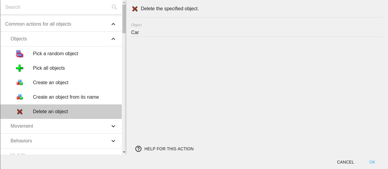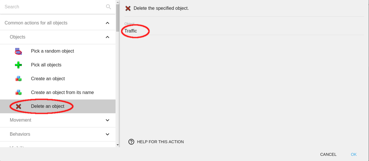 To solve this problem as well as to optimize the game by freeing up memory, we will add another action to the event which will delete the object Traffic.