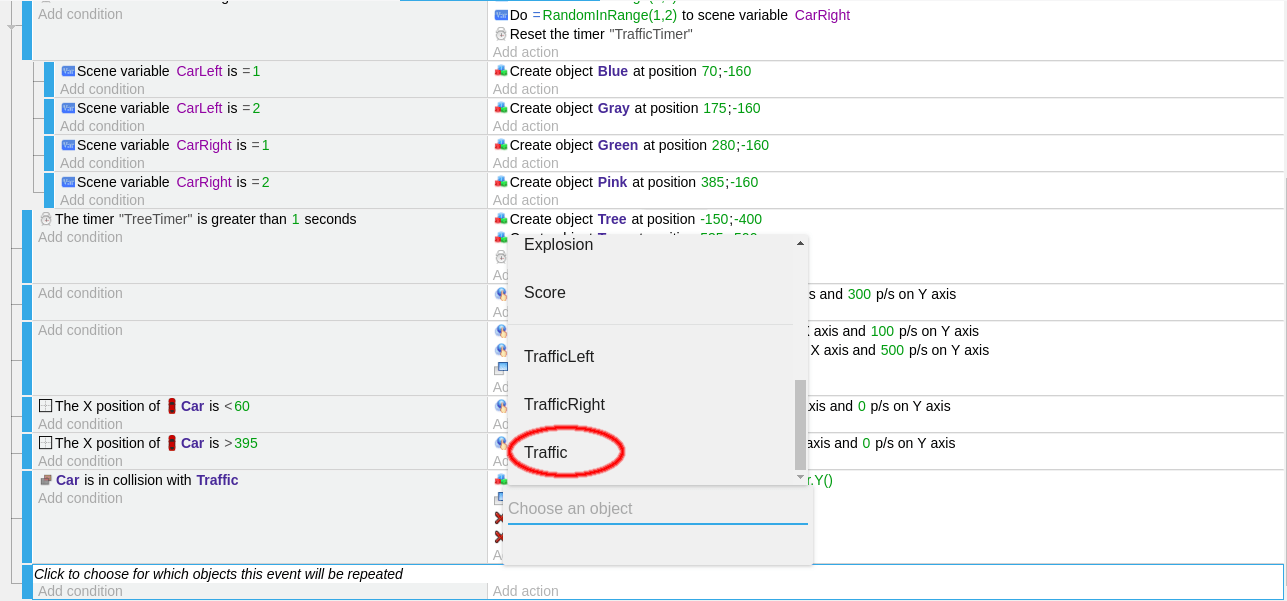 We need to repeat this event for each Traffic, so choose Traffic for the object to be repeated.