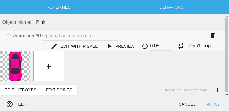 The object is called NewObject by default - you can see the name at the top of the dialog. It's a good idea to give a descriptive name to each object so that you can understand what they are when dealing with them in events. In our case, use the field to set the name to Car.